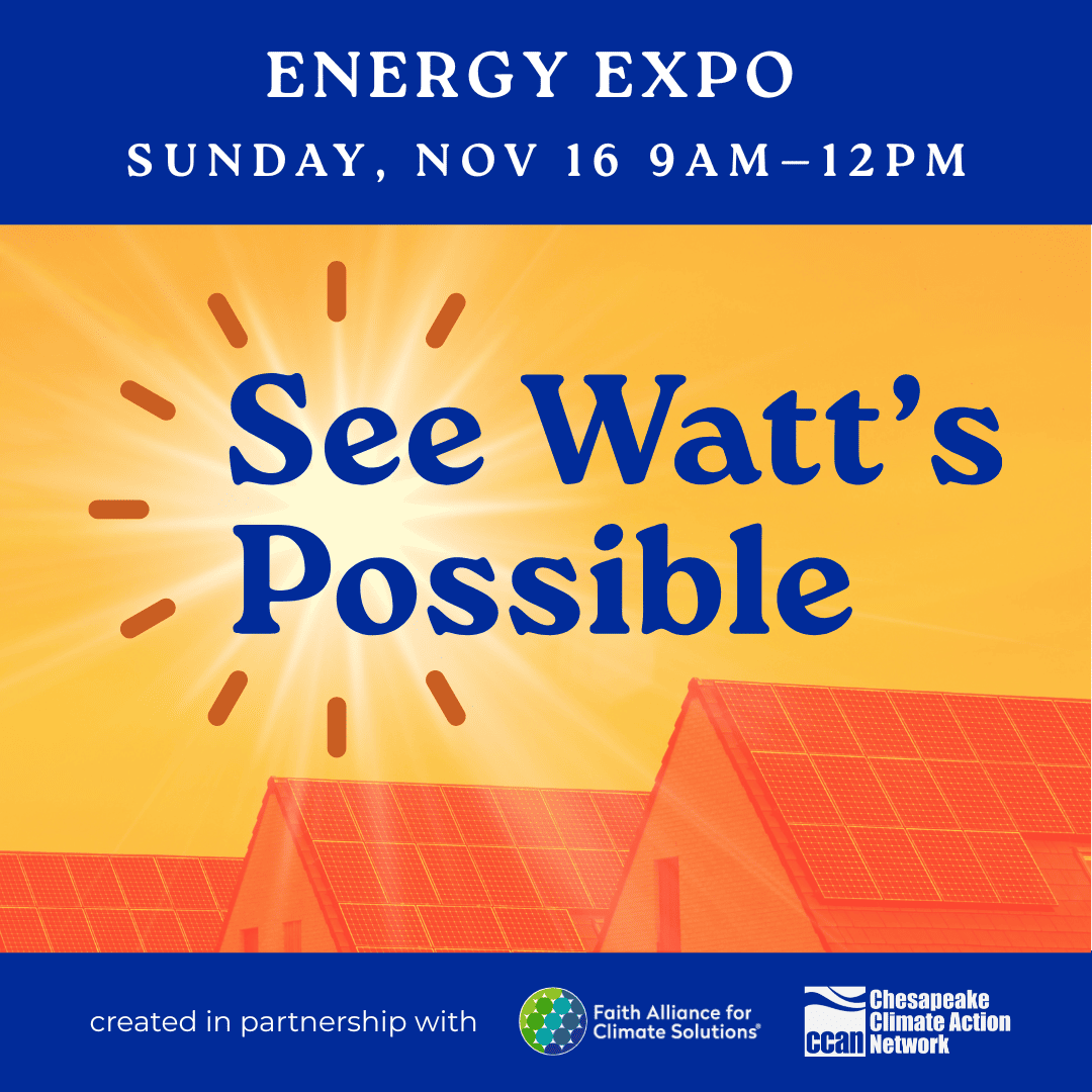 Join us in the parish hall from 9:00 a.m. to 12:00 p.m. Representatives from Faith Alliance for Climate Solutions and the Chesapeake Climate Action Network will be on hand to share information about energy conservation initiatives and conduct demonstrations. All are welcome to explore practical steps for engaging with creation care.
