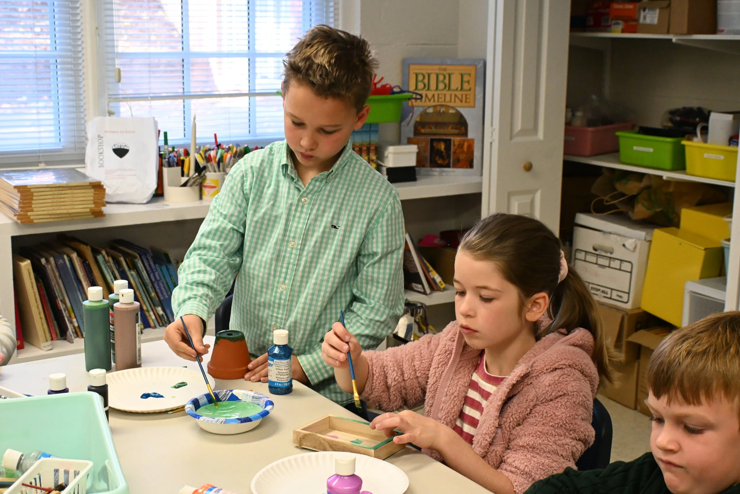 On Sunday mornings, children move from nursery care into age-based groups, including Godly Play for younger children and Bible-centered classes for elementary and preteens.
