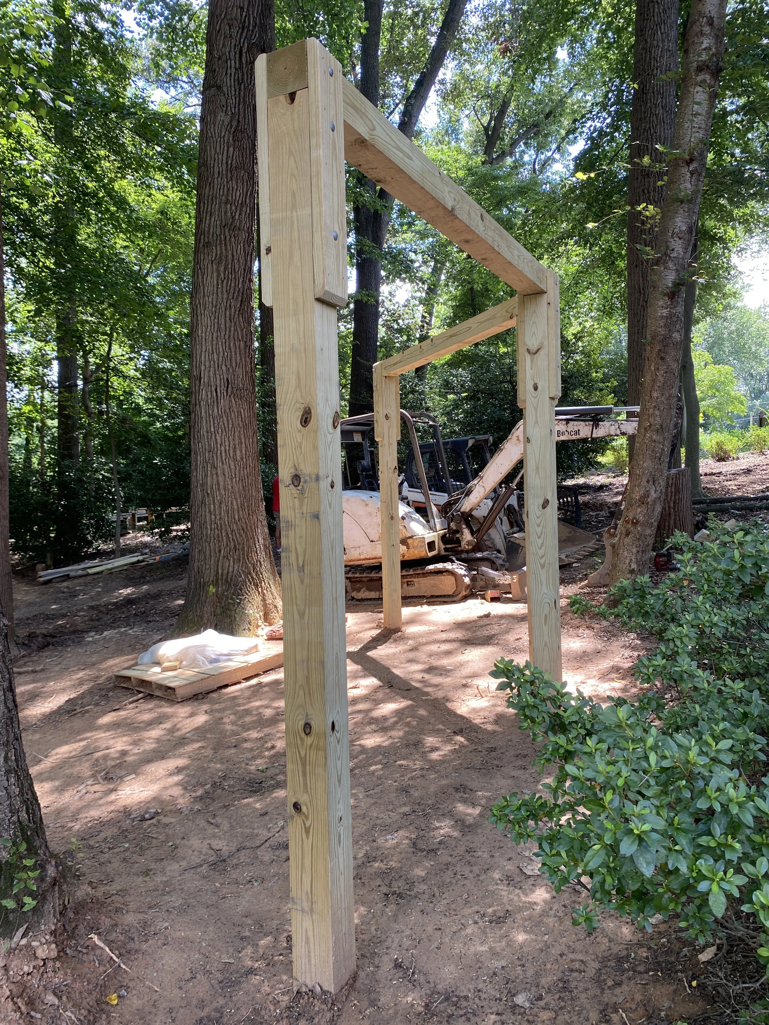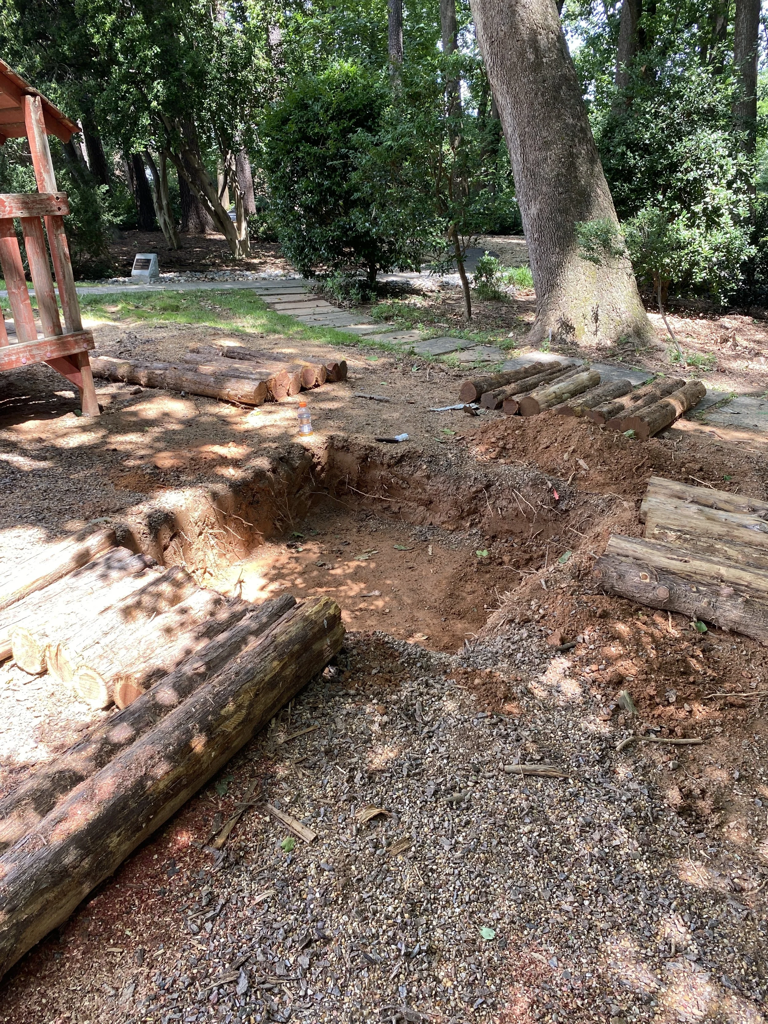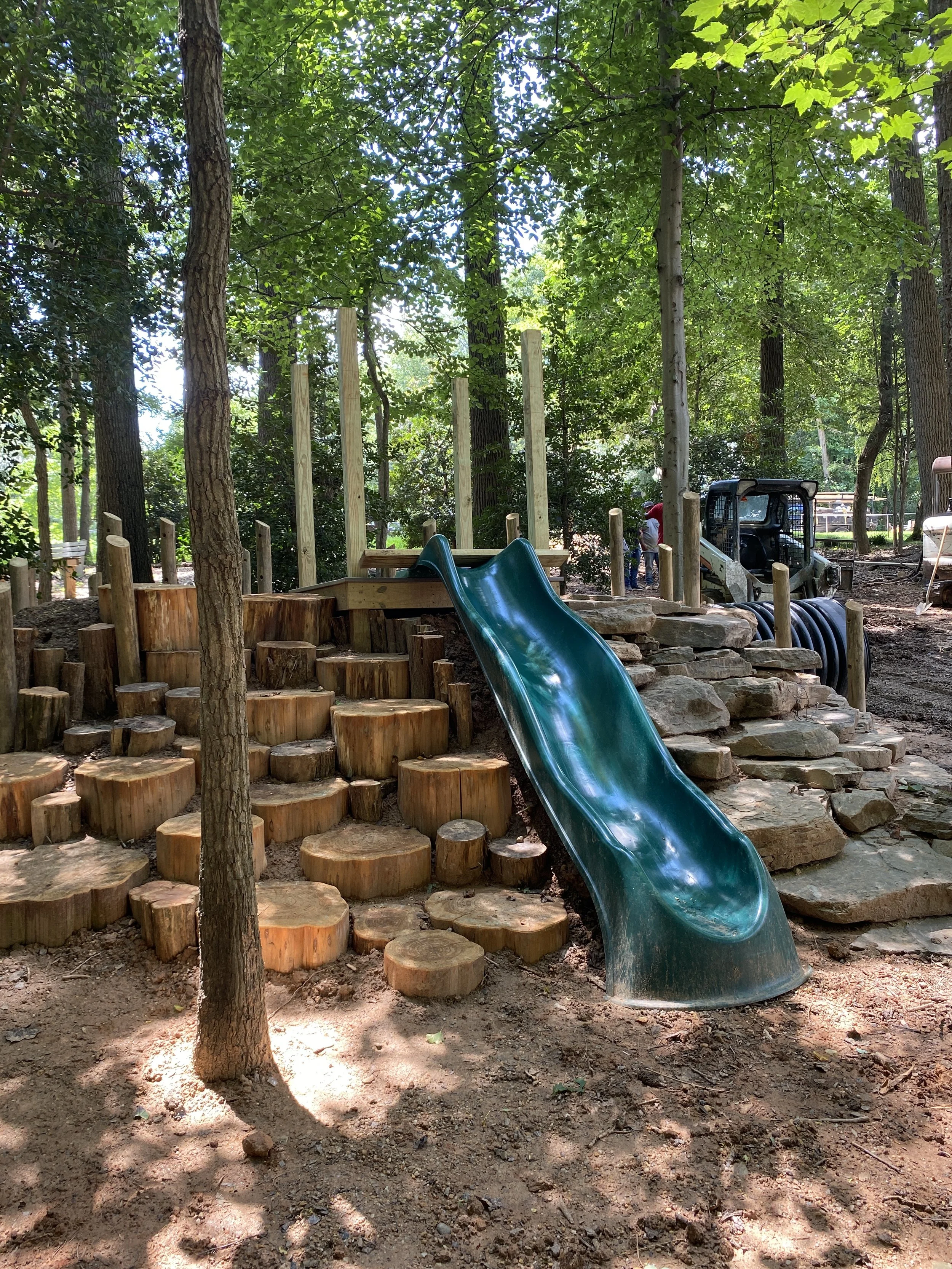 Over at the hill slide, things are close to finishing up! The hill was built using the sand repurposed from the original sand pit. It now includes a stump scramble made from old locust stumps that have been cleaned up and sealed for safe climbing (see first photo at the top of the page). In the fall, the hillside will be planted with native, shade-loving plants to help hold everything in place and keep the soil from eroding. The hill offers a few different ways to climb: some easy, some more of a challenge in order to train kids strength and problem-solving skills.