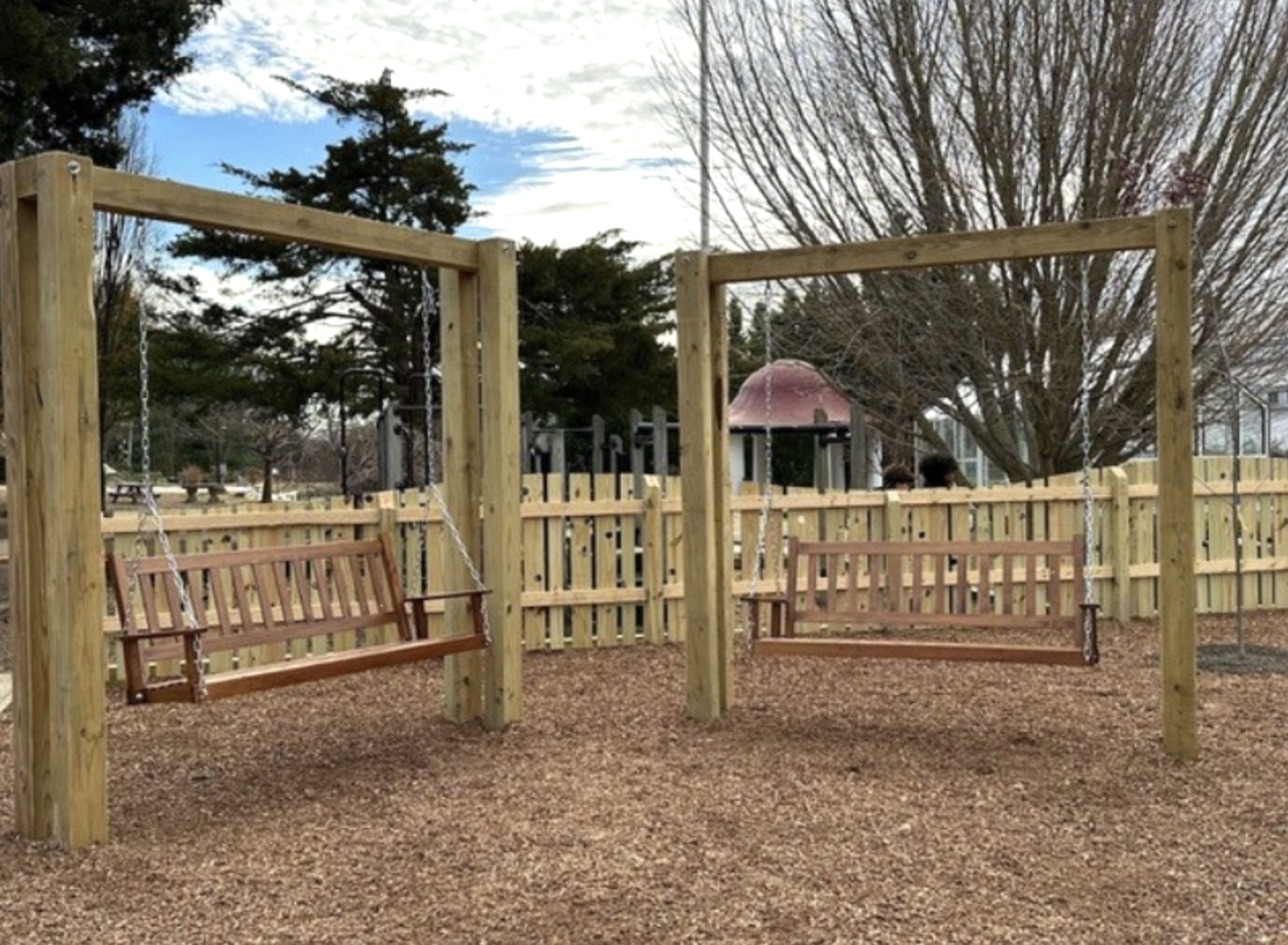 The team finished preparing the frame for the bench swing set. Once installed, the two swings will be perfect for soothing swinging and rocking, and whether kids want to relax on their own or chat with a friend.