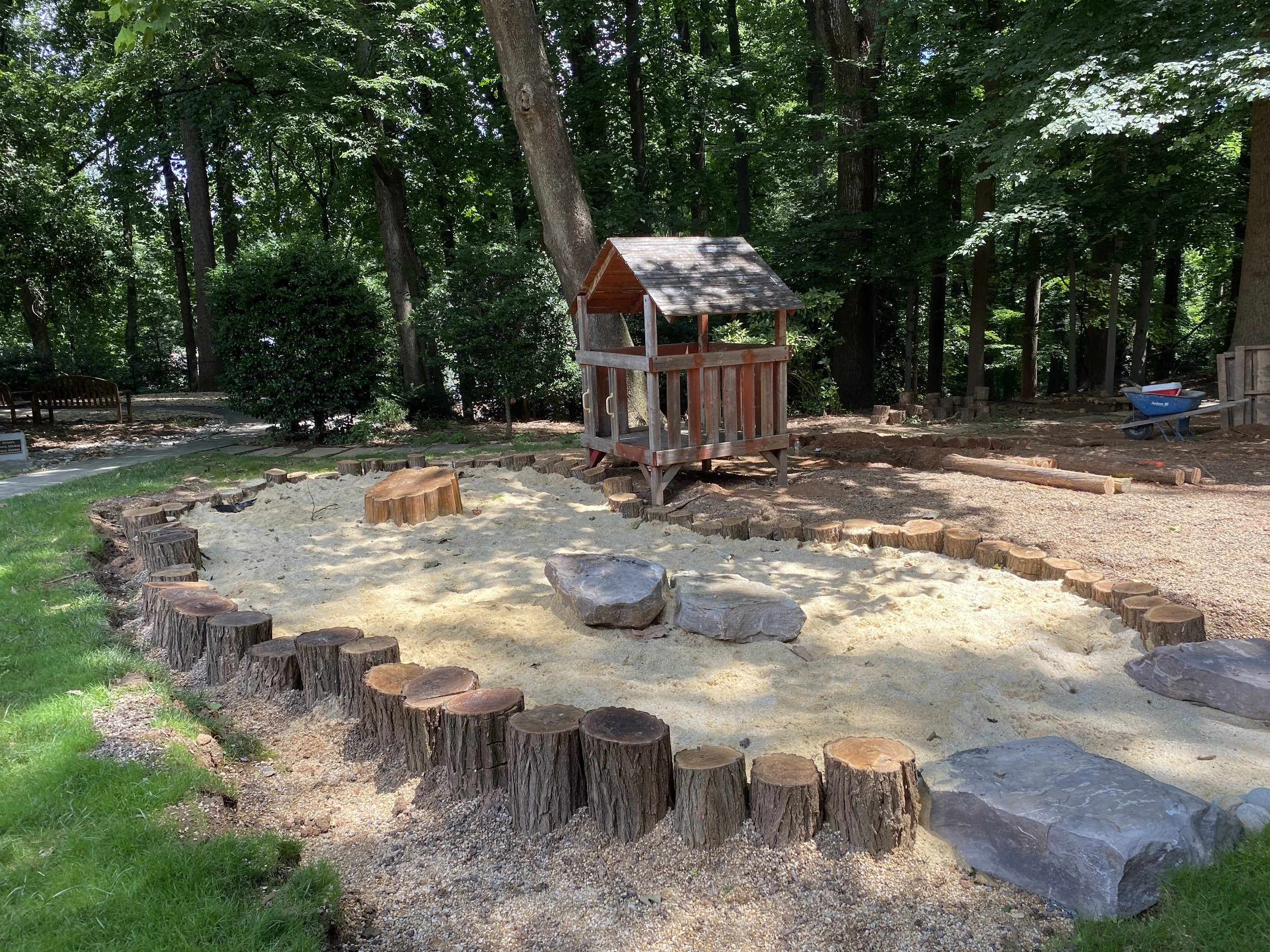 Pictured: Sand play area has been filled in and the playhouse has been relocated to its edge